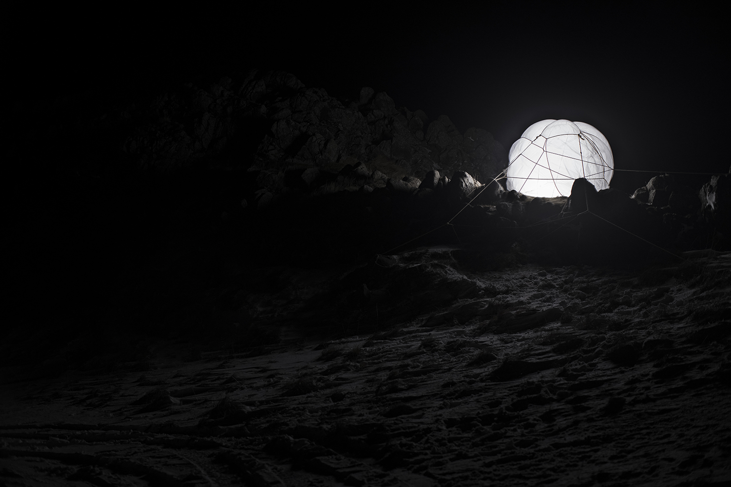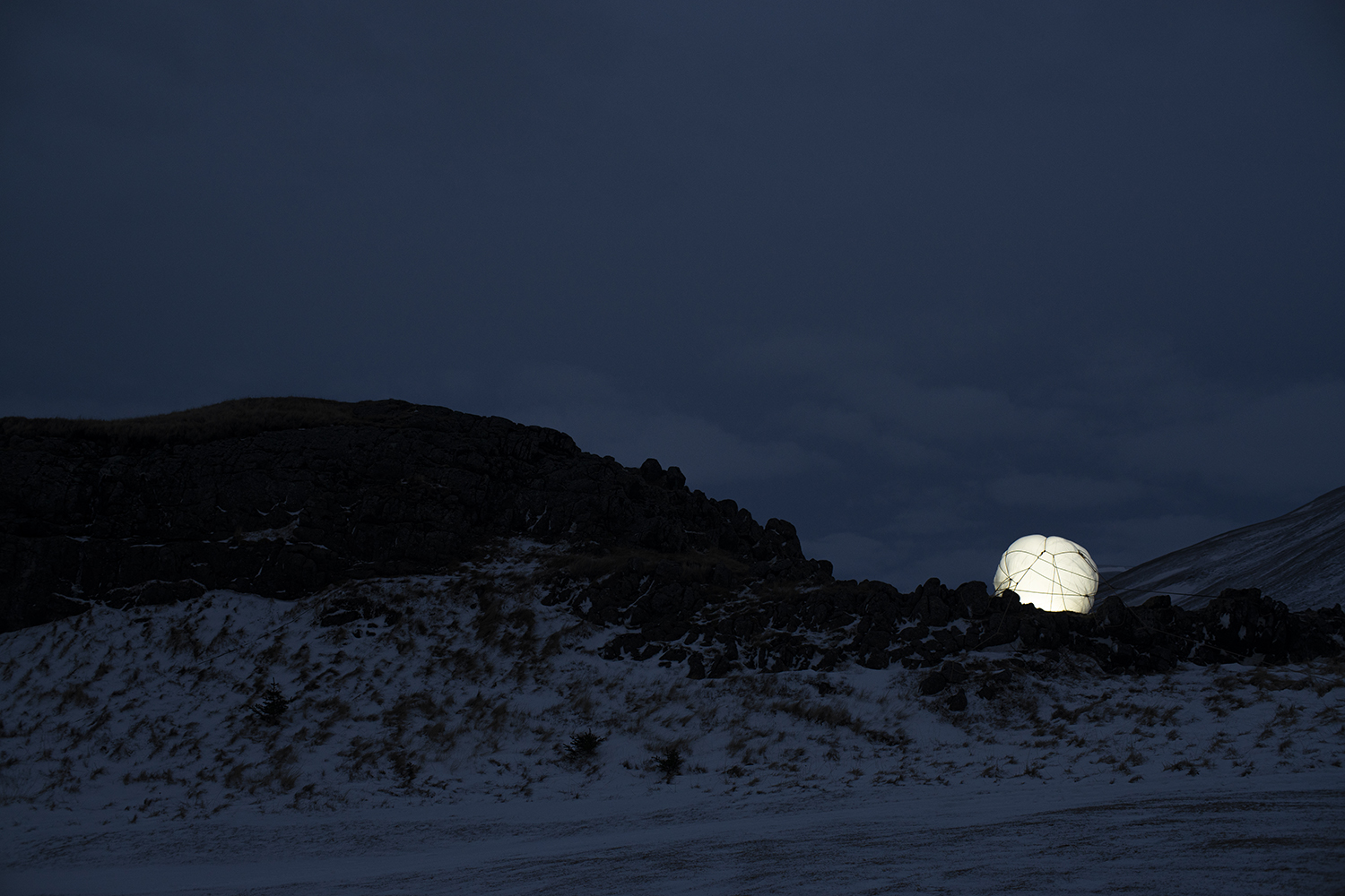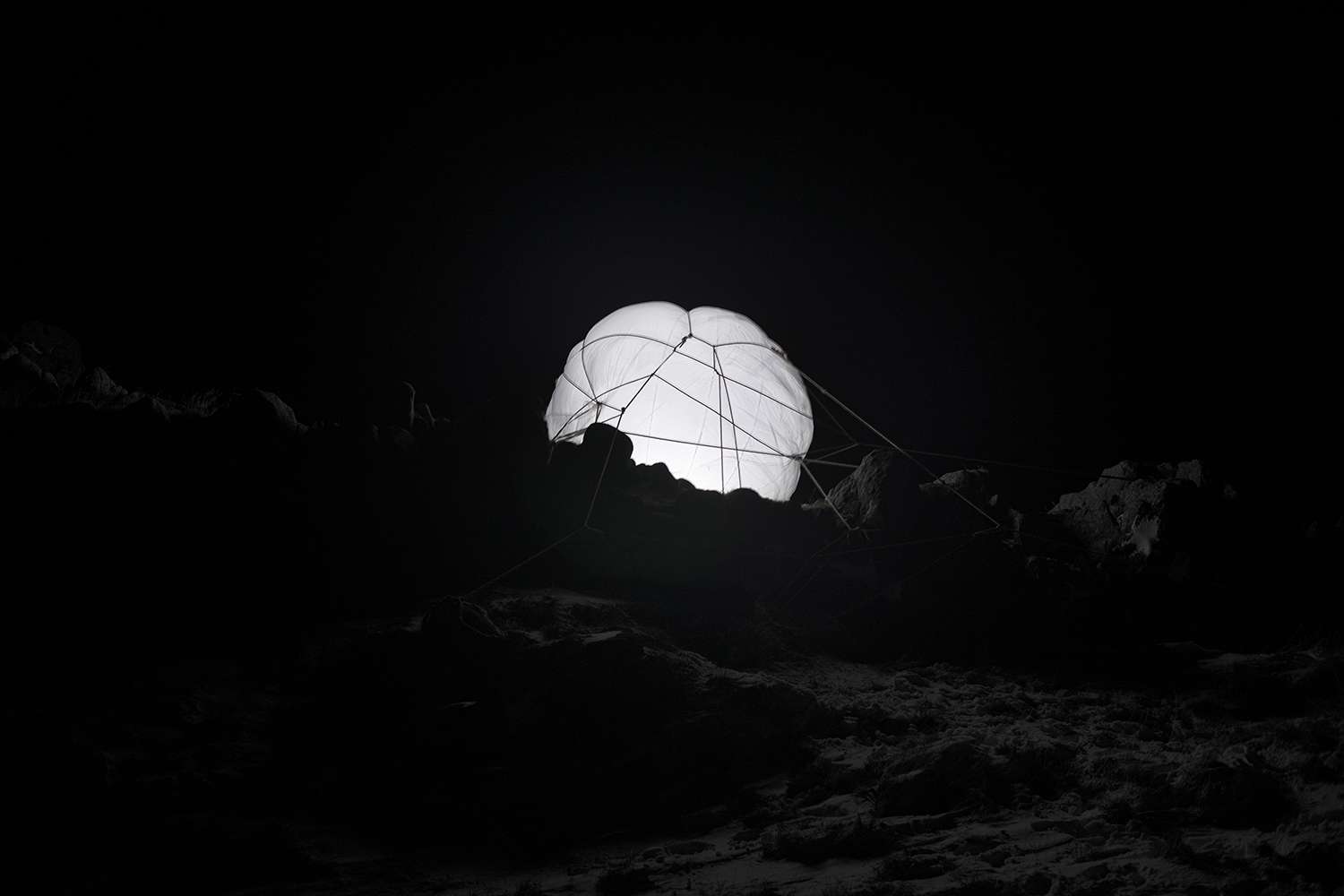 A luminous sphere, bound to the ground with rope and wrapped in plastic sheeting, emits a glow that activates the surrounding landscape. Its intensity responds to real-time solar and geomagnetic activity: as disturbances increase and the aurora becomes likely, the orb dims almost to black.