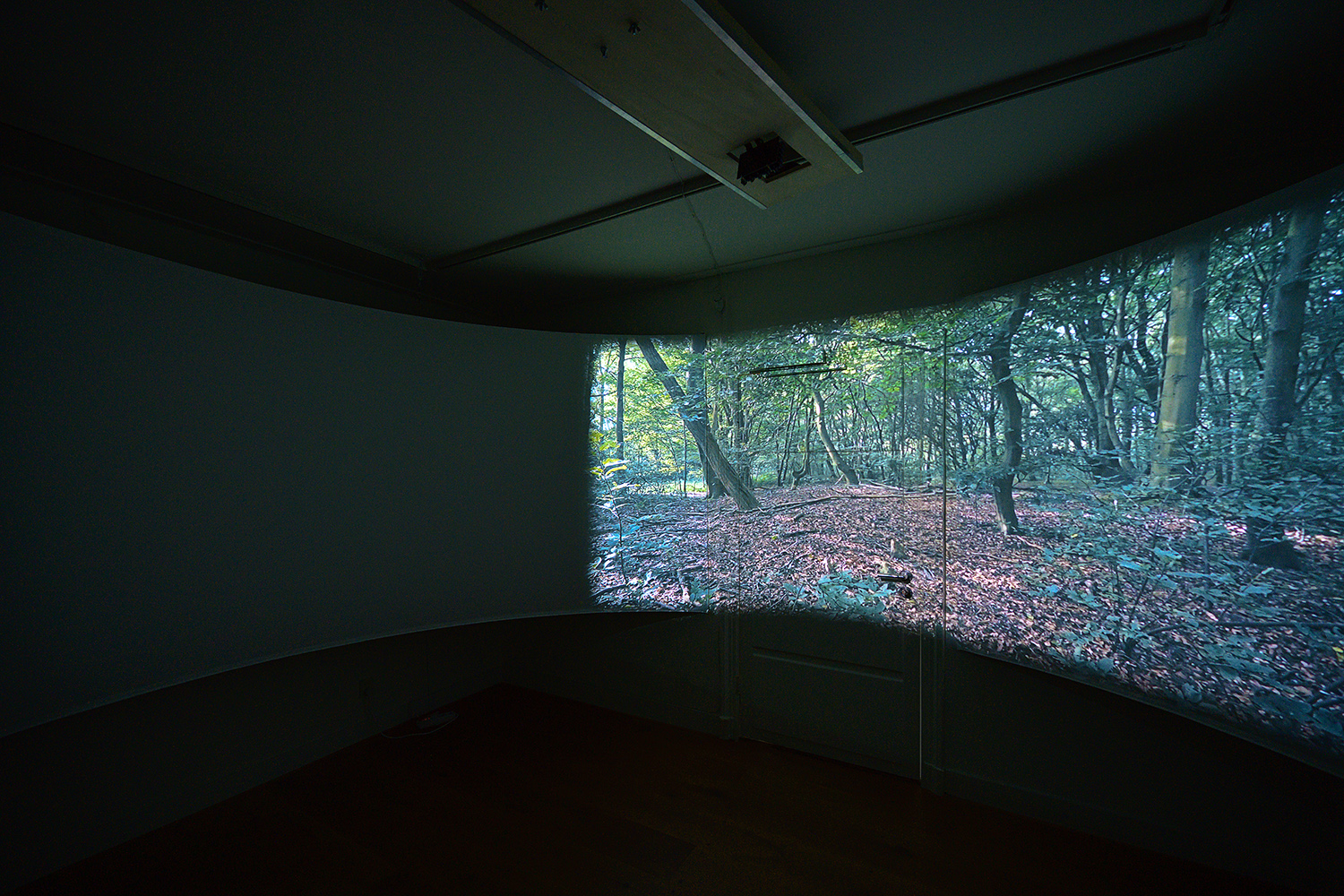 Rotating Panorama // Bos takes as its point of departure Piet Mondriaan’s early painting Bos (1898–1899). Projected onto the interior of a circular screen four metres in diameter—an echo of the 19th-century panorama—the moving image rotates slowly around the viewer, becoming a ‘window’ to an external environment; this of a forest.